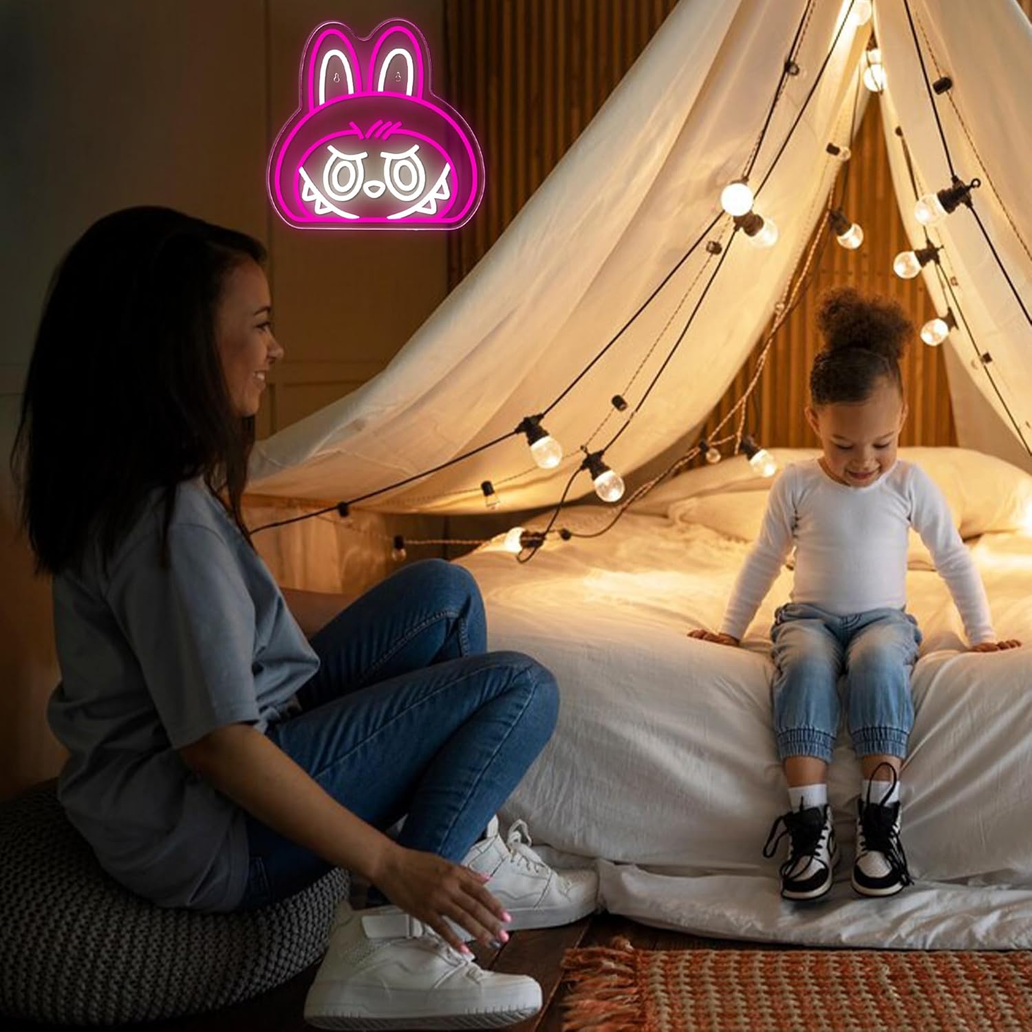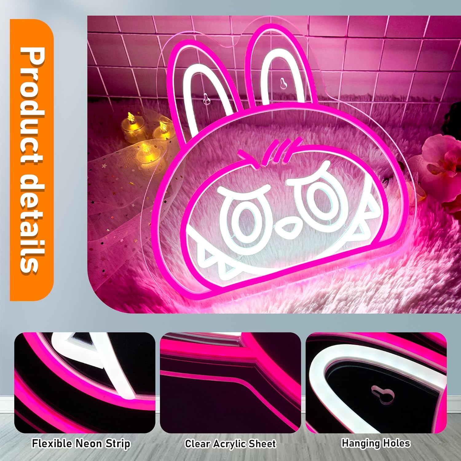- DESIGN FEATURES: Pink LED neon cartoon character design with adjustable brightness settings for customizable ambiance