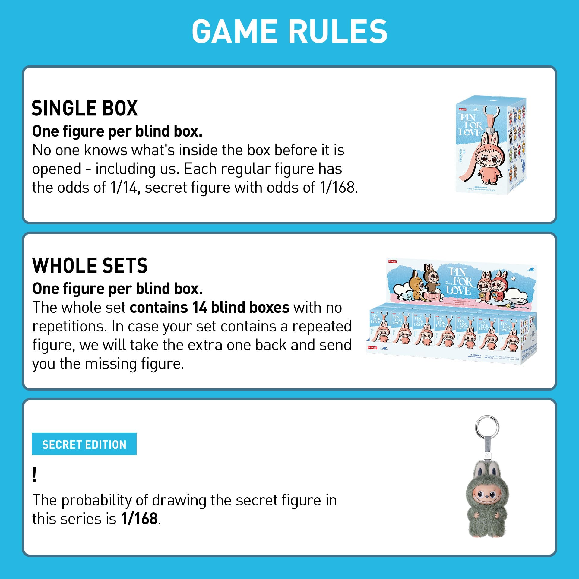 - Random Design: Blind boxes are fully random and we cannot accept requests for specific items. There chances of getting the secret edition are usually 1/168. When purchasing the whole set, there will be no duplicates figures. However, if you order multiple single boxes, there is possibility to get duplicates.